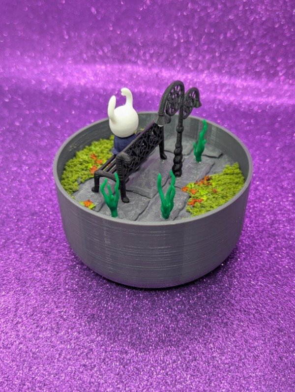 Diorama de Hollow Knight sentado en el banco.